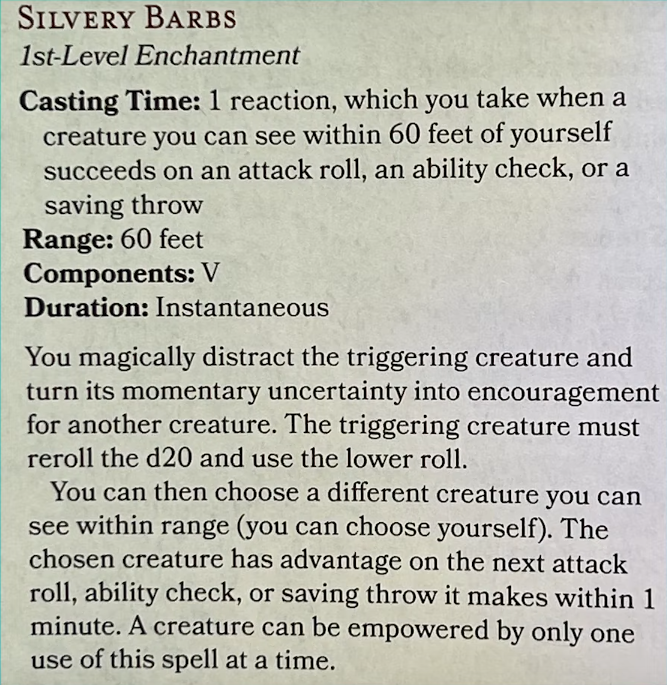 Silvery Barbs was an Unearthed Arcana subclass feature that was playtested for the Strixhaven setting. After class-variable subclasses were abandoned, the feature was converted to a level 1 enchantment spell for bards, sorcerers, and wizards. This spell is published in D&D’s new book, Strixhaven: A Curriculum of Chaos.