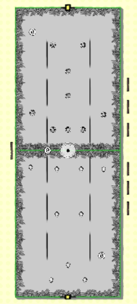 The game is played on an open, flat, dirt field, generally free of rocks & debris, that is 360 feet  long by 144 feet wide. The field is split lengthwise down the entirety of the center into 72 feet wide halves, and crosswise at 120 feet intervals. These six resulting areas are marked off with white paint borders. Particularly enterprising/wealthy teams have been known to pay to have the sections magicked to different colors. Straddling the centerline at each end of the playing field is a netted goal, 9 feet wide by 3 feet tall. One narrow end of the field is to be facing North, indicating the “head” of the field. Three referees patrol the playing surface to control the action during the run of play.
