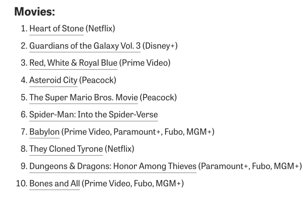 Also, a ton of people are still watching D&D: Honor Among Thieves. It’s been available in the United States via Paramount+ for more than three months. From its release week on streaming it has been a top ten movie every week.