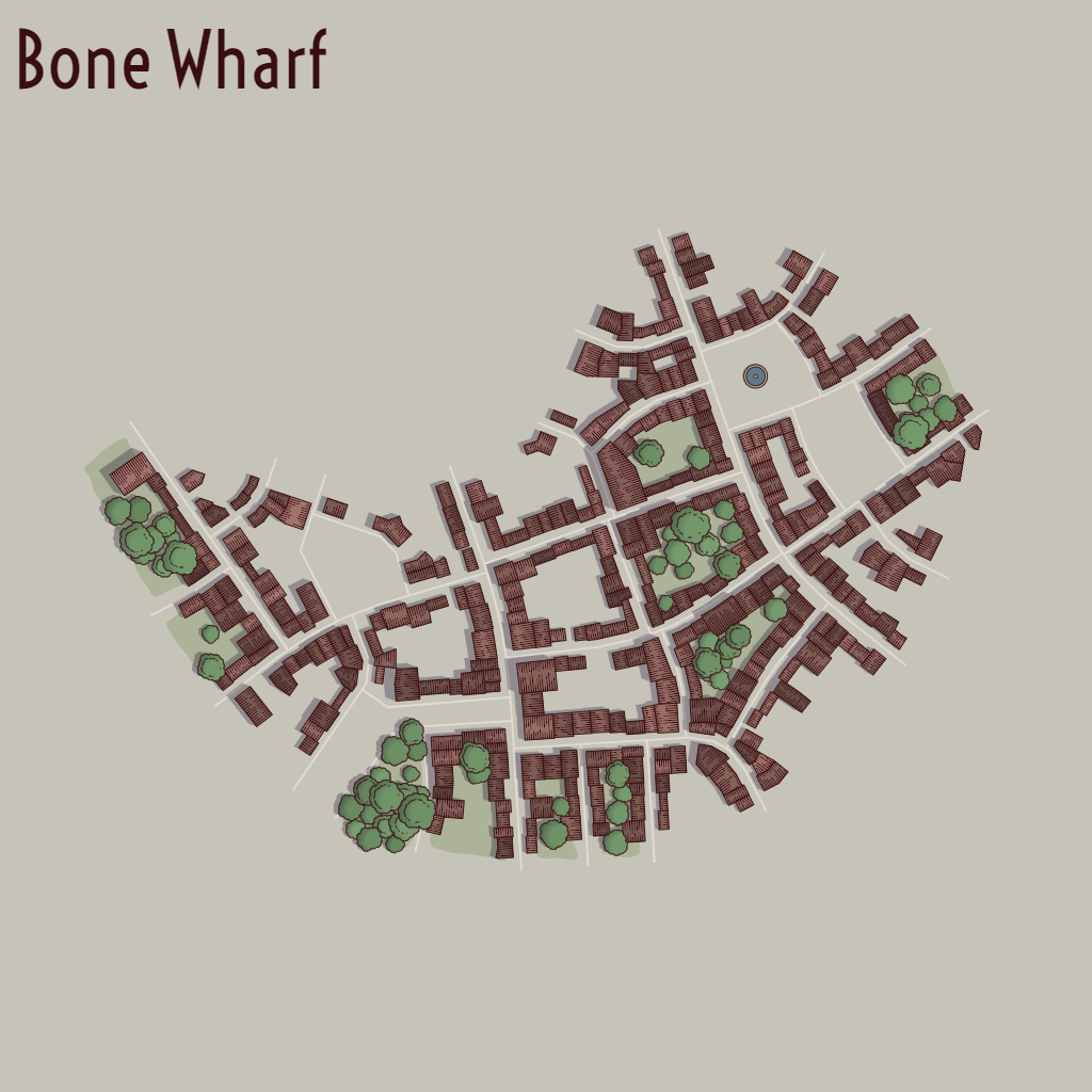 The map can be an underground cavern in the Dwarven city trope. First shift the colors using the ‘0’ key to one that has some darkness to it. Pretend that the trees are mushrooms, and that the streets are the passageways and tunnels to the rest of the world. Bone Wharf is now a Mountain Dwarf city.