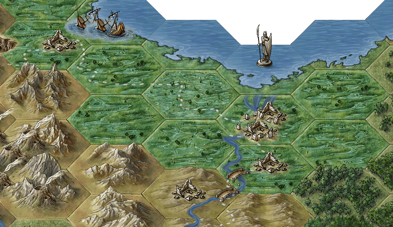 A hex map that shows Entrytown, the bog-city of Sheljar, the statue, harbor, and what is now the goblin village to the west.